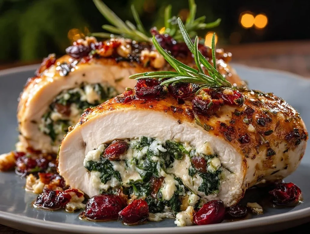 This elegant stuffed chicken recipe combines warm Mediterranean flavors with a bright pop of cranberry sweetness, making it ideal for holiday dinners, special gatherings, or whenever you want a meal that feels impressive without being complicated.
