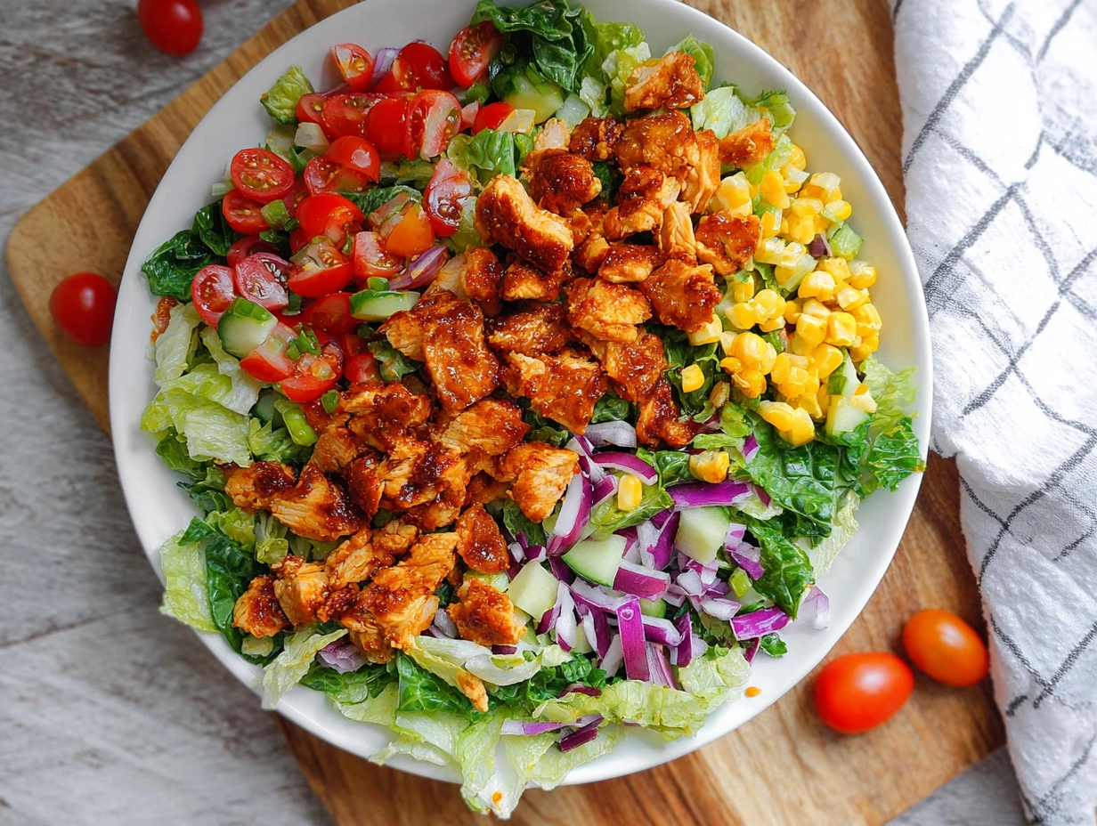This salad combines tender, slightly caramelized chicken with crisp, fresh vegetables. The sweet heat of honey and hot sauce balances beautifully with the mild greens, creating a satisfying, flavorful meal.