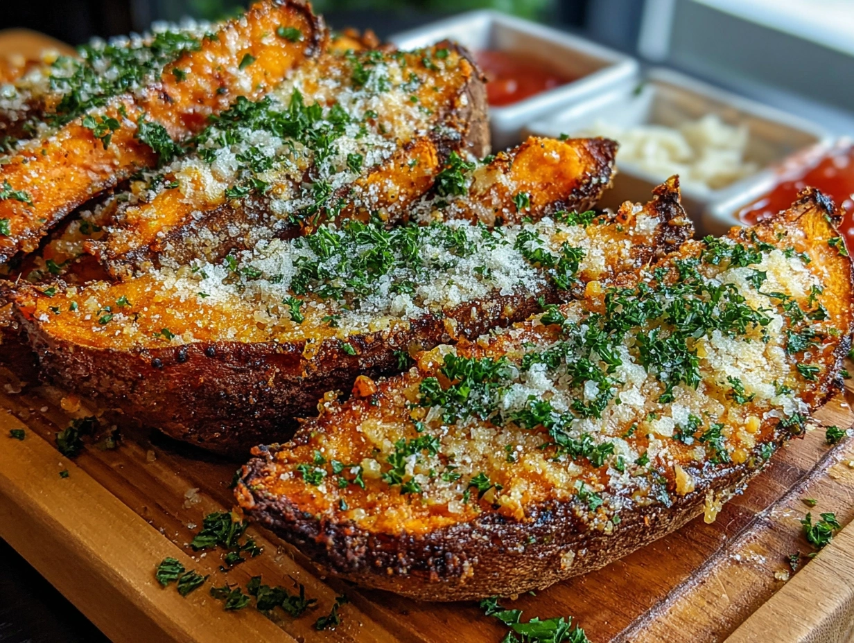 Garlic Parmesan Sweet Potato Wedges – Crispy, Cheesy & Delicious
